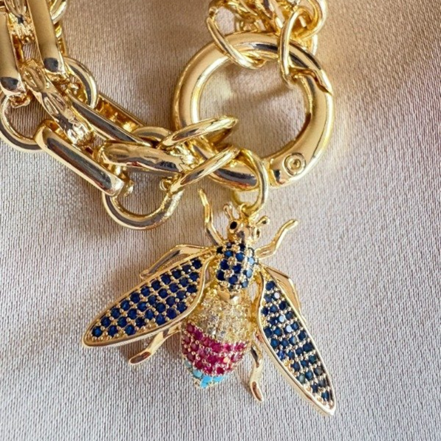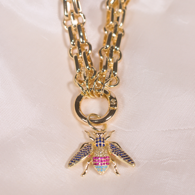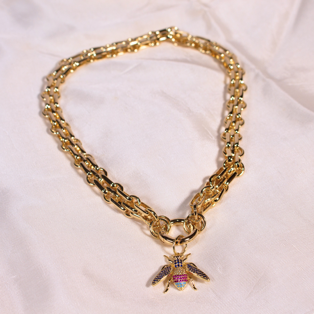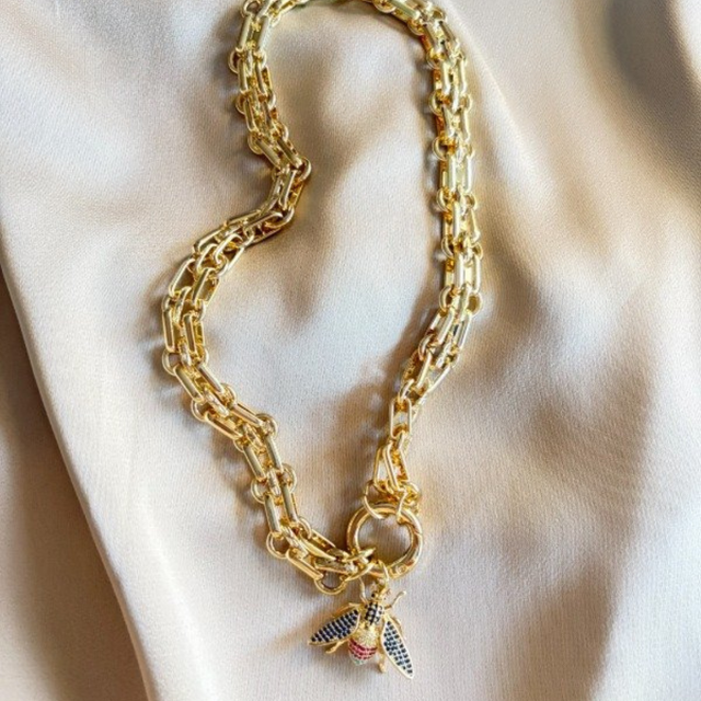 Cadena en acero dorado,con cierre cenral, y dije con piedras engarzadas,