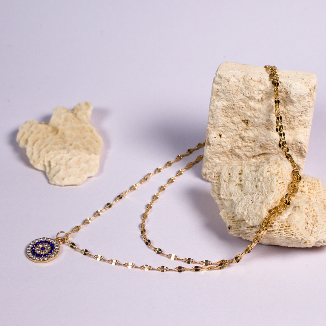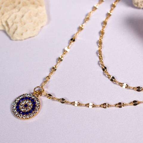 Cadena doble enchapada en oro , con dije central , piedras engarzadas