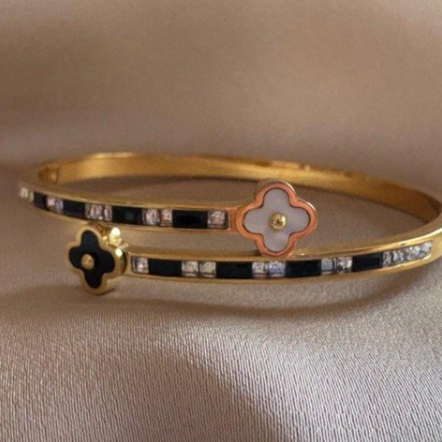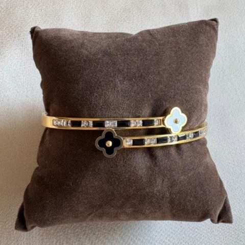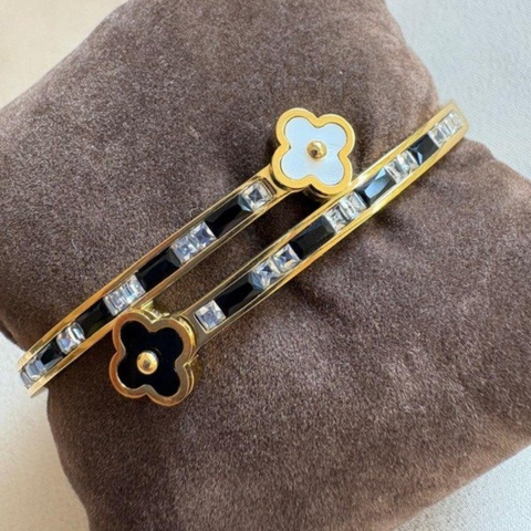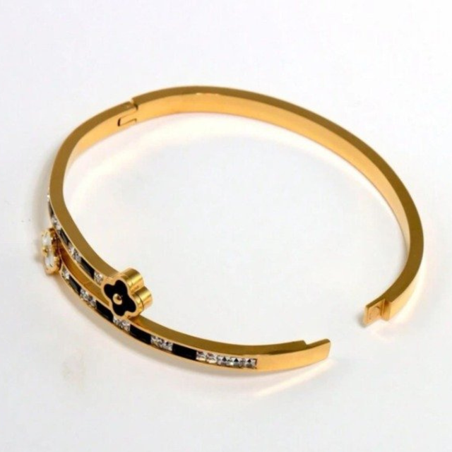 Pulsera acero dorado, cierre a presión, con piedras engarzadas y nacar